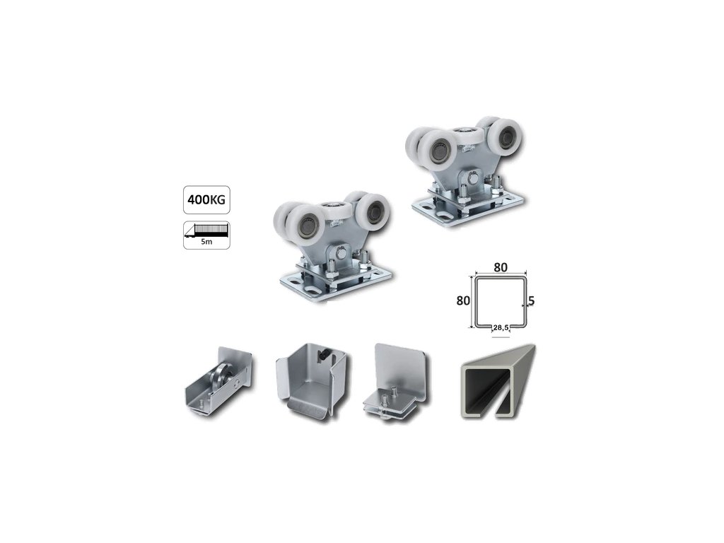 Samonosný systém 80x80x5 mm s NYLONOVÝMI vozíkmi – komplet s POZINKOVANÝM C-profilom pre posuvnú bránu do 400 kg / prejazd do 4,5 m
